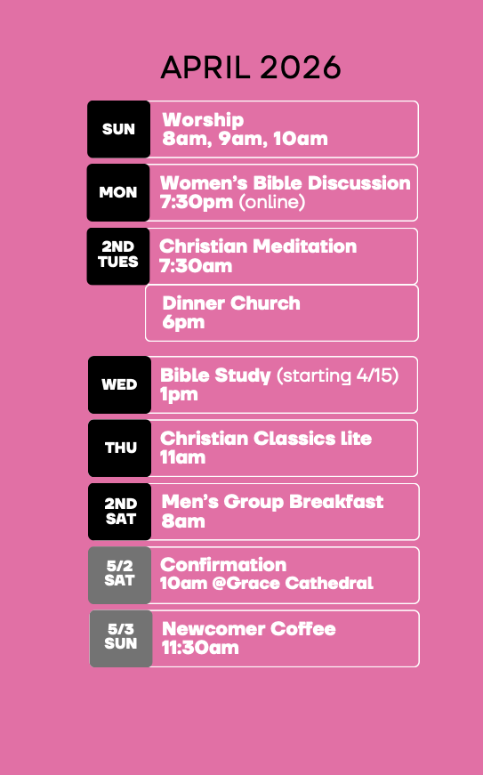 Men’s Group Retreat: May 28-30 The St. John’s Men’s Group meets for its annual retreat at St. Dorothy’s Rest, the Episcopal camp and retreat center deep in the redwoods near Occidental, California. The retreat begins in the afternoon on Thursday, May 28 and concludes at noon on Saturday, May 30, 2026. Enjoy good discussion, good food, good fellowship and community in a tranquil environment. Rev. Skip Fotch and Rev. Chris Rankin-Williams will help guide our discussion program. There is plenty of free time for relaxation. Sign up here.